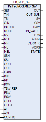 Действие управляющего выхода, применяемое в блоке ручной загрузки с переключателем AUTO/MAN (MLD_SW), является действием “позиционного типа”. Значение управляющего выхода (MV) — это значение, являющееся результатом автоматического расчета управляющего