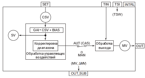 Функция автоматического расчета управляющего воздействия преобразует значение, полученное от другого функционального блока как значение задания при каскадном управлении (СSV), в значение управляющего выхода (MV).