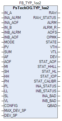 Типовая схема голосования "Один из двух" (1oo2) основан на двух аналоговых входах. Расчетное значение для аналоговой индикации рассматривается отдельно от логики отключения при голосовании. Функциональный блок TYP_1oo2 выполнен на основе базового функционального блока PVI и, соответственно, наследует его функции. В таблице ниже представлен список основных функций блока.