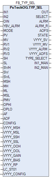 Функциональный блок TYP_SEL сравнивает сигналы от 2 блоков контроллера и автоматически выбирает минимальный/маскимальный сигнал в качестве управляющей выходной величины (MV). Другими словами, конечные элементы одного контура могут управляться таким образом, что с помощью блока селектора сигналов контролируются 2 переменные и поддерживаются на безопасной стороне заданных точечных значений, тогда как в обычном случае конечные элементы управляются на основе одной переменной.