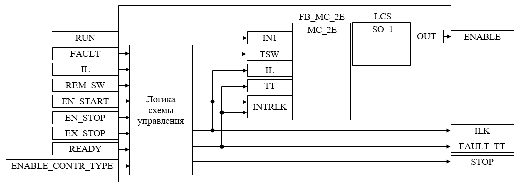 Подпрограмма логики схемы управления используется для приема и обработки команд останова/разрешения пуска/разрешения останова от внешней логики с принудительным переводом блока в автоматический и ручной режим, для управления блоком LCS в зависимости от конфигурационного параметра ENABLE_CONTR_TYPE, для формирования команды останова и для формирования обобщенных сигналов блокировки и неисправности двигателя.