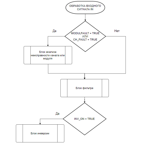 В штатном режиме работы значение входного сигнала сначала проходит через блок инверсии, где при включенной функции инвертирования значение меняется на противоположное входному значению и выдается на значение выхода OUT.