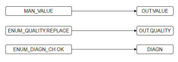 Для перевода алгоритма в режим подмены необходимо на входе MAN_ON установить значение TRUE. При этом на выход алгоритма транслируется значение MAN_VALUE, и качество выходного сигнала устанавливается в значение REPLACE.