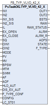 Типовой клапан TYP_VLVD_42_X применяется для клапанов пневматического и гидравлического типа. В этом типовом варианте цифровое управление реализовано с помощью двух цифровых выходов и двух цифровых входов (индикация обратной связи) с использованием функционального блока MC_3E. Режим работы блока должен быть MAN (ручной режим), чтобы обеспечить возможность вмешательства оператора. Если режим блока AUT, то он управляется логикой или последовательными программами.