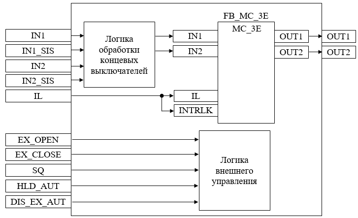 Блок FB_MC_3E базового типа MC_3E используется для передачи команд открытия/закрытия/останова оператором и для отображения состояния клапана.