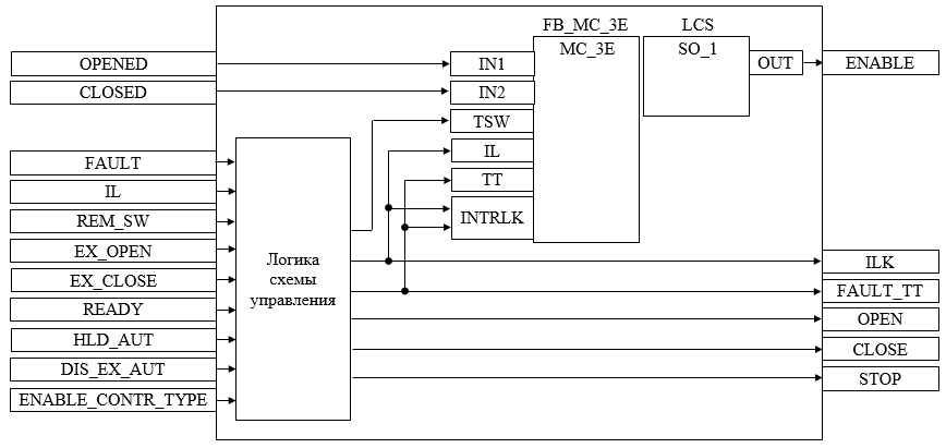 Подпрограмма логики схемы управления используется для приема и обработки команд открытия/закрытия от внешней логики с принудительным переводом блока в автоматический и ручной режим в зависимости от конфигурационных параметров HLD_AUT, DIS_EX_AUT и DIS_EX_CMD, для управления блоком LCS в зависимости от конфигурационного параметра ENABLE_CONTR_TYPE, для формирования команд открытия/закрытия/останова и для формирования обобщенных сигналов блокировки и неисправности привода задвижки.