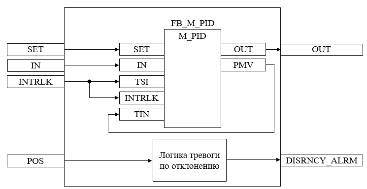 Блок FB_M_PID базового типа M_PID обеспечивает функцию пропорционально-интегрально-дифференциального регулирования с учетом отклонения технологической переменной (PV) от значения уставки (SV).