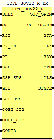 Данный блок предназначен для работы с электромагнитным клапаном с двумя соленоидами и двумя концевыми выключателями и сбросом. С помощью входного параметра SS блок может быть сконфигурирован по типу FC (SS = 1, при срабатывании защиты клапан переводится в безопасное положение ЗАКРЫТО) или по типу FO (SS = 0, при срабатывании защиты клапан переводится в безопасное положение ОТКРЫТО), или по типу FL (SS = 2, при срабатывании защиты клапан переводится в безопасное положение СТОП).