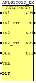 Функциональный блок ANLG1OO2D проверяет состояние данных входов и разницу между входными значениями IN1 и IN2 для определения выхода, а также принимает решение о наличии входной ошибки и устанавливает на выходе безопасное значение VAL, если состояние, при котором разница между входными значениями DIF больше допустимого диапазона DEL продолжается в течение периода времени, превышающего допустимое значение DLT.