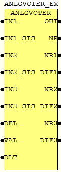 Функциональный блок ANLGVOTER проверяет состояние данных входных значений и разницу между средним значением и входными значениями (IN1, IN2 и IN3) для определения выходного значения (OUT). Функциональный блок ANLGVOTER принимает решение о наличии входной ошибки и устанавливает на выходе безопасное значение (VAL), а не входное значение, если состояние, при котором разница между средним значением и каждым из входных значений больше допустимого диапазона продолжается в течение периода времени DLT.