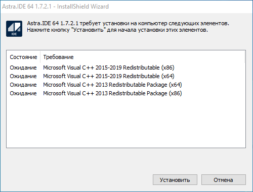 2. Для работы Astra.IDE могут потребоваться дополнительные программные компоненты. Если они отсутствуют на компьютере, программа-установщик предложит их установить. Нажмите кнопку "Установить".