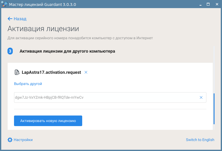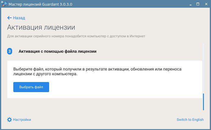 14. Нажмите кнопку "Выбрать файл" и выберите файл формата *.license, перенесенный с компьютера с доступом в Интернет.