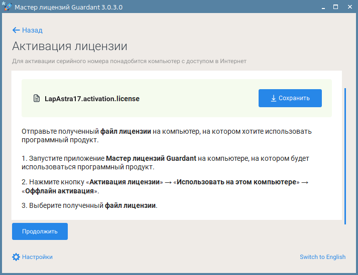 12. Перенесите полученный файл активации лицензии формата *.license на компьютер без доступа в Интернет, на котором требуется активировать лицензию.