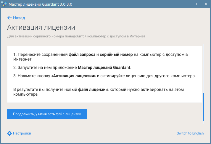 13. На компьютере без доступа в Интернет нажмите кнопку "Продолжить, у меня есть файл лицензии".