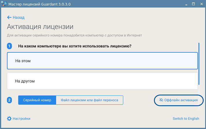 3. В окне Активация лицензии выберите компьютер, на котором будет использоваться лицензия "На этом" и нажмите "Оффлайн активация".