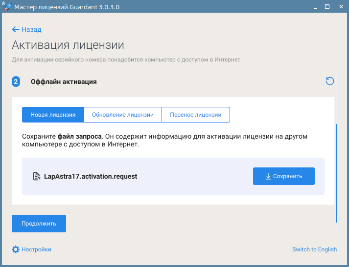 4. На вкладке Новая лицензия нажмите кнопку "Сохранить", сохраните на диске файл запроса формата *.request и нажмите кнопку "Продолжить".