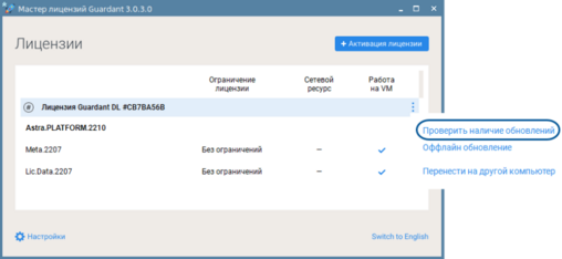 5. В окне Лицензии в меню ключа выберите команду "Проверить наличие обновлений".