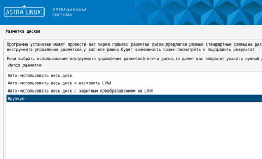 8. В окне "Разметка дисков" выберите "Вручную" и нажмите кнопку "Продолжить".