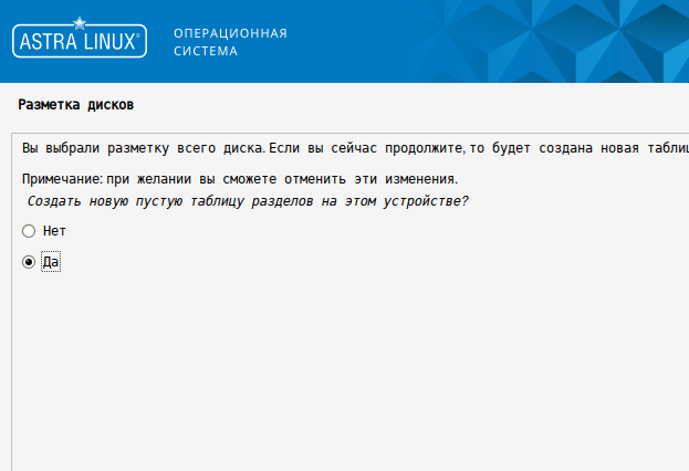 10. Выберите "Да", чтобы создать пустую таблицу разделов на этом устройстве, и нажмите кнопку "Продолжить".