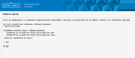 15. Проверьте параметры разметки диска, выберите "Да" и нажмите кнопку "Продолжить".