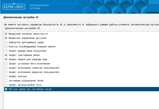 Необходимо обязательно выбирать следующие настройки ОС: