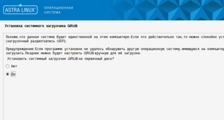 22. Выберите "Да", чтобы установить системный загрузчик GRUB, и нажмите кнопку "Продолжить".