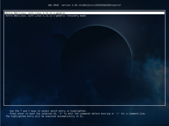 27. После запуска ПК выберите "AstraLinux GNU/Linux, with Linux 6.12.11-1-generic" и нажмите клавишу "Enter".