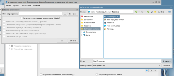 11. Добавьте созданный скрипт, который будет запускаться в киоске. Для этого нажмите кнопку "+", далее на кнопку "многоточие" и выберите путь до скрипта в папке пользователя с ограниченными правами и нажмите кнопку "Открыть".