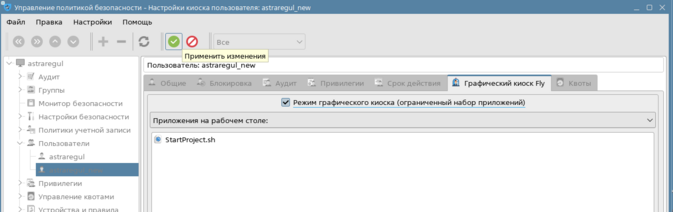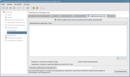 10. Выберите пользователя для режима киоска, перейдите во вкладку "Графический киоск Fly" и отметьте режим графического киоска.