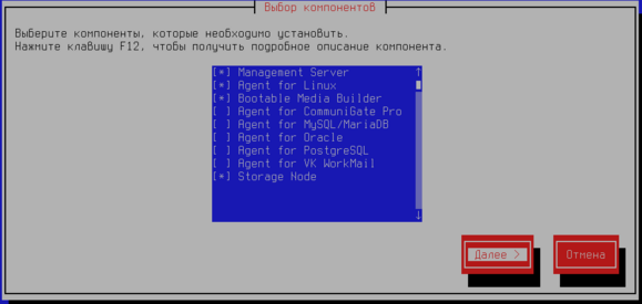 5. Для установки Кибер Бэкап на сервер управления для администрирования киберзащиты выберите пункты "Management Server", "Agent for Linux", "Bootable Media Builder" и "Storage Node". Нажмите кнопку "Далее".
