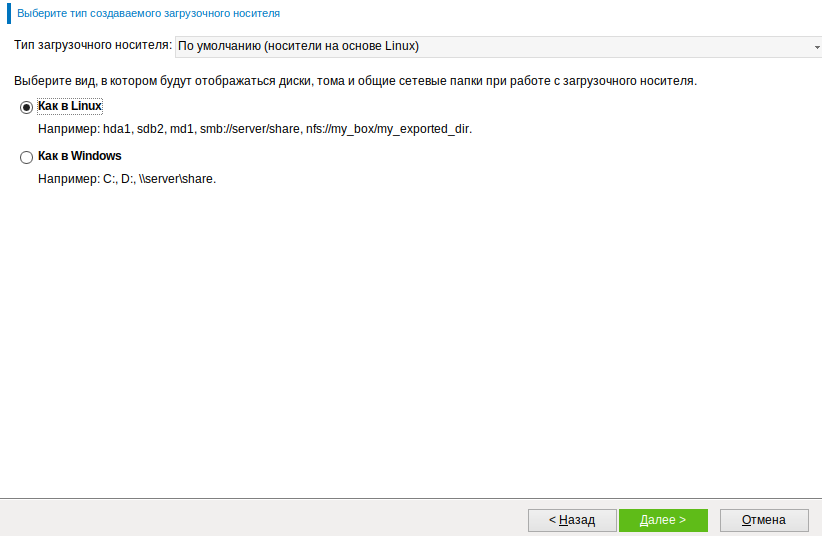 4. Выберите "Тип загрузочного носителя": По умолчанию (носители на основе Linux).