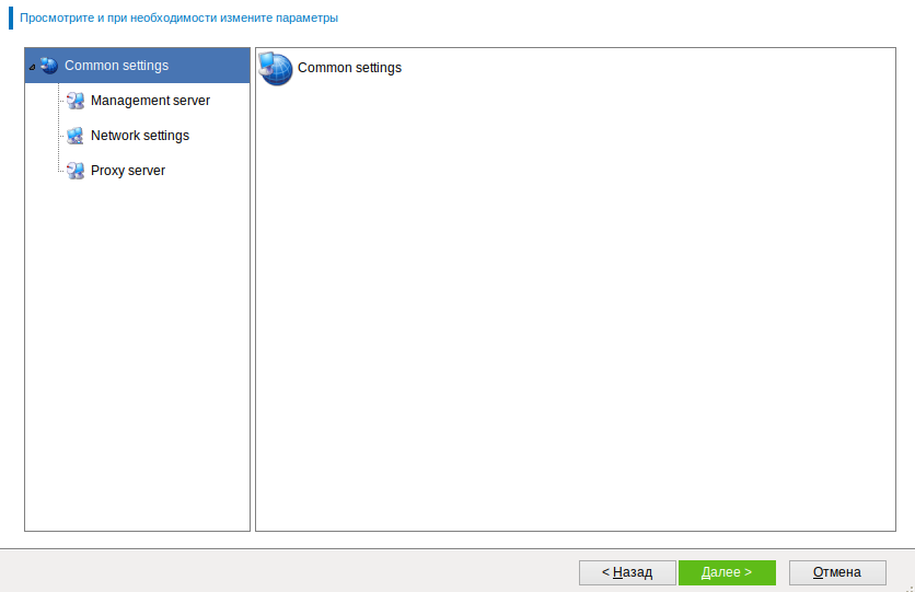 7. В окне параметров оставьте значения по-умолчанию и нажмите кнопку "Далее".