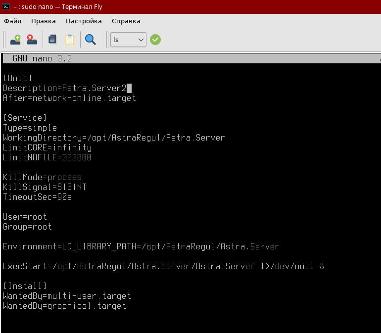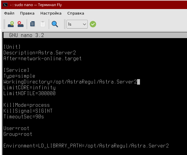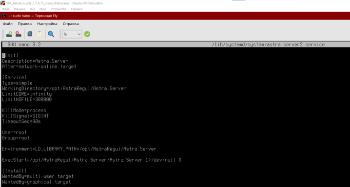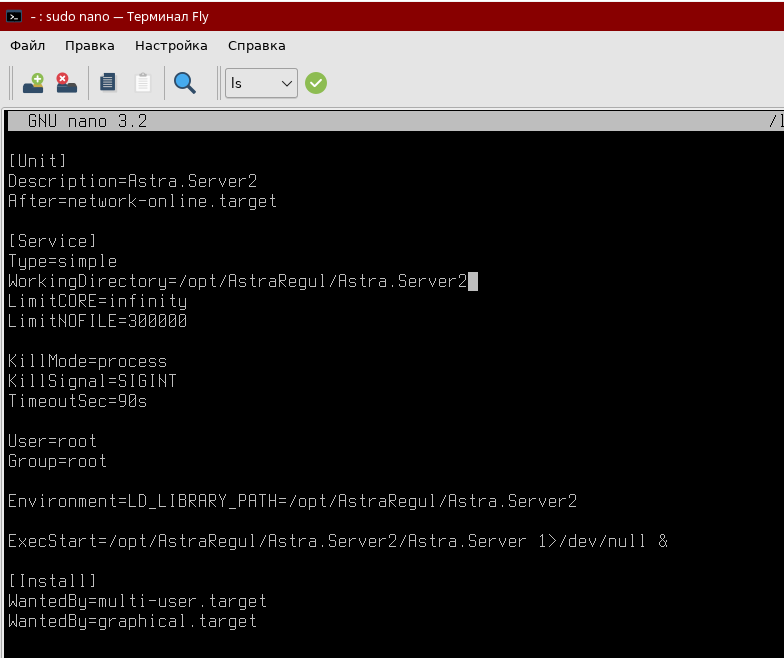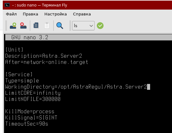 8. В открывшемся файле измените описание сервиса в параметре Description (раздел Unit) на Astra.Server2: