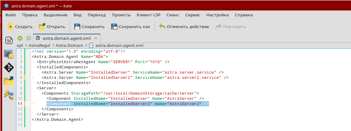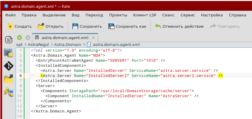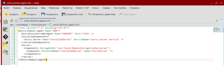 Откройте файл astra.domain.agent.xml при помощи любого текстового редактора, например, Kate. Файл расположен по следующему пути: