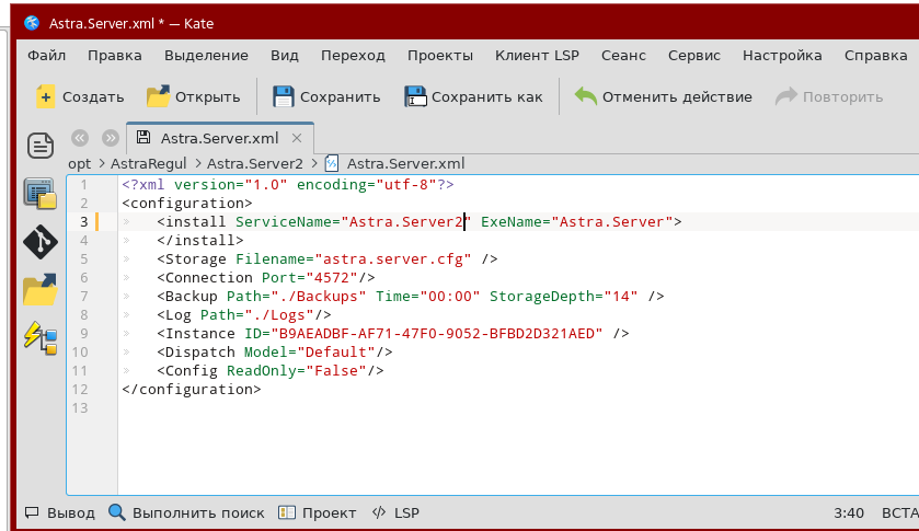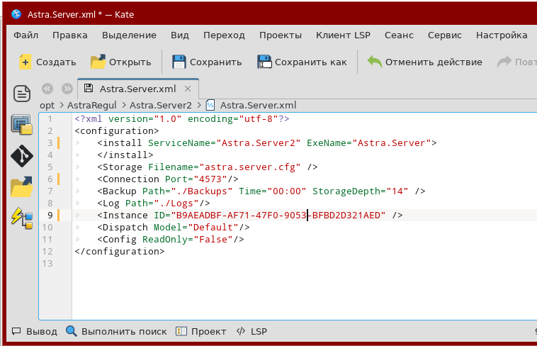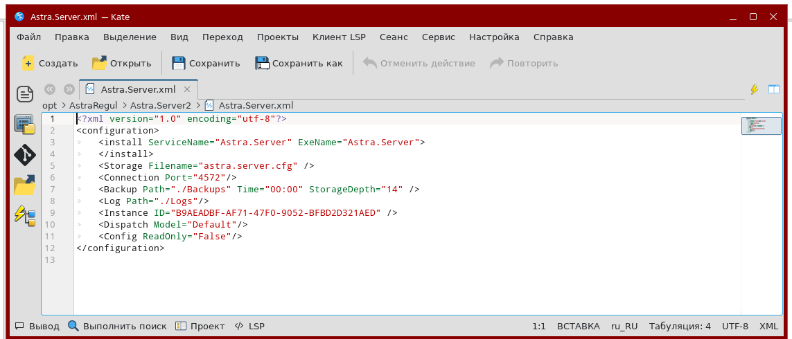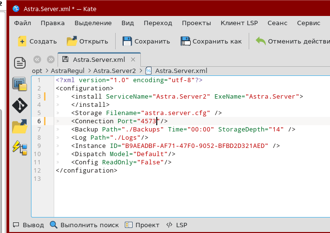 2. Перейдите в скопированную папку и откройте файл Astra.Server.xml при помощи любого текстового редактора, например, Kate :