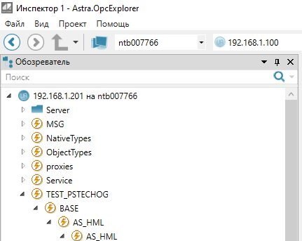 7. Подключитесь тестовым клиентом и убедитесь в доступности модулей и сигналов Astra.Server2.