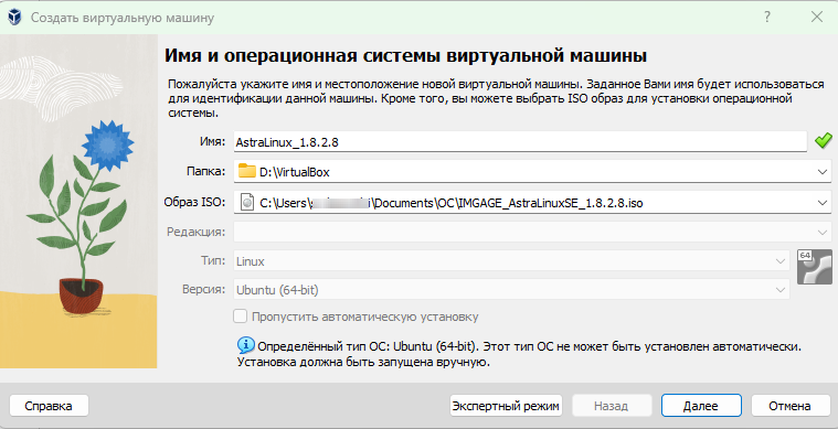 2. Введите в поле "Имя" название виртуальной машины, в поле "Образ ISO" выберите путь до файла с образом ОС в формате *.iso. Нажмите кнопку "Далее".