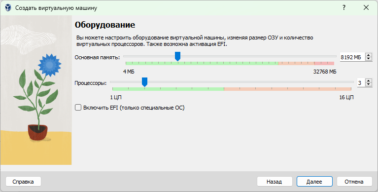 3. Выберите размер основной памяти и количество процессоров (в пределах зеленой области) и нажмите кнопку "Далее".