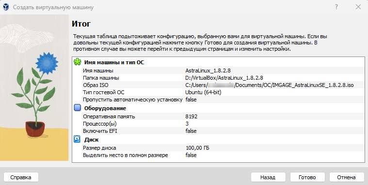 5. В окне "Итог" проверьте конфигурацию виртуальной машины и нажмите кнопку "Готово".