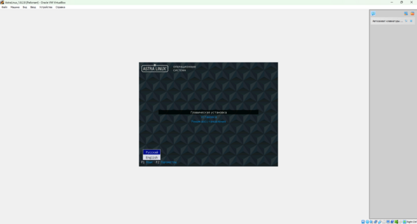 7. После запуска ВМ откроется окно с менеджером загрузки ОС AstraLinux. Выполните установку ОС, описанную в разделе "1.2.1 AstraLinux".