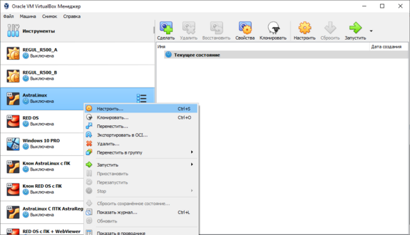 1. Откройте Oracle VM VirtualBox Менеджер, нажмите правой кнопкой мыши по ВМ на базе ОС AstraLinux и выберите "Настроить...".
