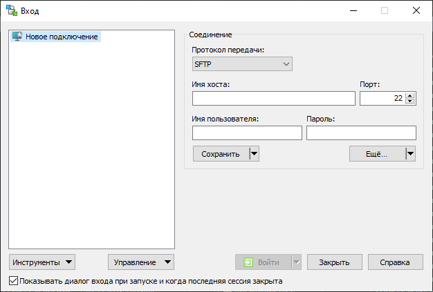 5. Для подключения к ВМ откройте "WinSCP". Откроется окно с вводом данных для подключения.