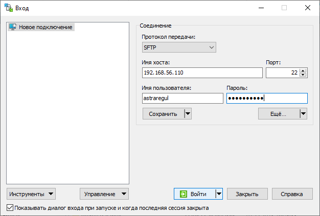 6. В поле "Имя хоста" укажите IP адрес виртуальной машины, значение в поле "Порт" оставить без изменений. В поле "Имя пользователя" введите имя пользователя. В поле "Пароль" укажите пароль пользователя. Нажмите кнопку "Войти".