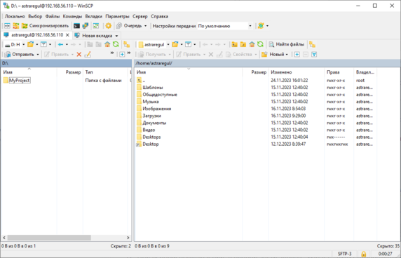 8. После подключения, в правой части окна "WinSCP" отображаются файлы и директории, находящиеся на ВМ. В левой части - файлы и директории ПК, с которого произведено подключение.