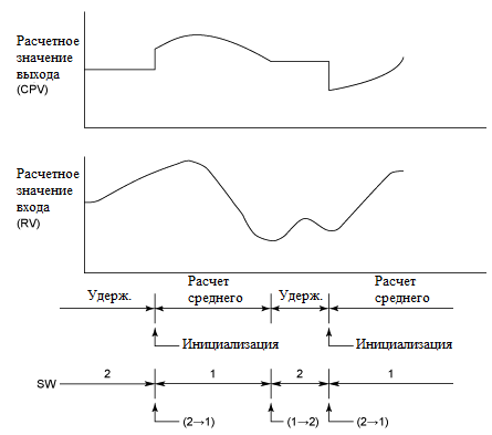 Когда переключатель управления (SW) переводится в положение “0”, текущее расчетное значение выхода (CPV) сохраняется как предыдущее среднее значение (PREV), после чего расчет среднего значения начинается снова. Эта процедура называется “инициализацией интегрального расчета”.