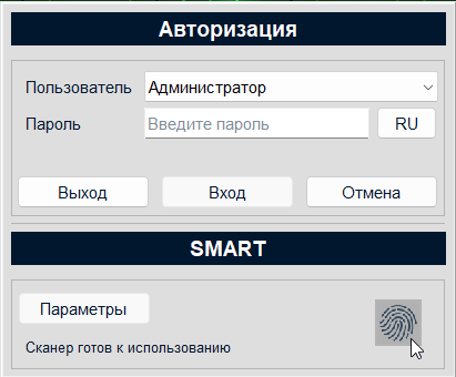 При успешной инициализации сканера и запуску считывания, появится надпись "Анализ отпечатка". Необходимо приложить палец и ожидать авторизации. При успешной авторизации диалоговое окно закроется.