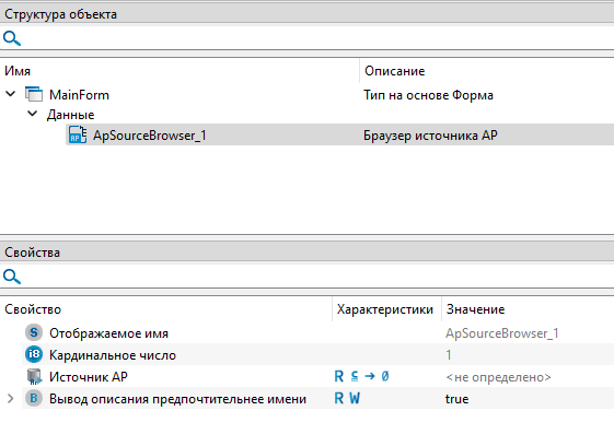 Компонент "Браузер источника АР" расположен в юните AP Библиотеки компонентов. Экземпляр этого типа не отображается на форме и виден только в области "Структура объекта".