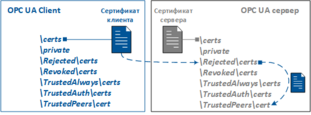OPC UA Client отправляет сертификат OPC UA серверу, а сервер по умолчанию его отклоняет - помещает в папку: