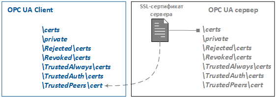 Если связь между модулем OPC UA Client и OPC UA сервером устанавливается через HTTP*-соединение, то на стороне OPC UA сервера в папке \certs генерируется SSL-сертификат. Чтобы разрешить обмен данными между OPC UA сервером и модулем OPC UA Client, SSL-сертификат сервера нужно вручную переместить в папку \TrustedPeers\cert на стороне клиента.