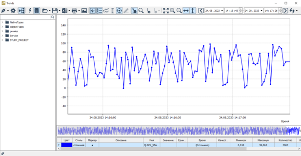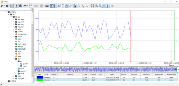 Как только вы перенесете сигнал на трендовое поле или в легенду, начнется построение графика сигнала. Графики строятся в реальном времени по значениям, поступающим от источника данных. Текущий момент времени отмечается на трендовом поле красной линией, если такая опция включена администратором.